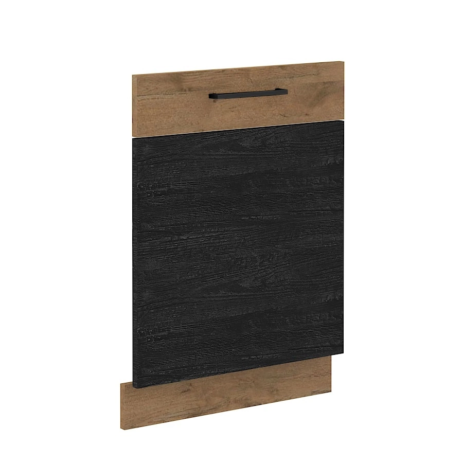 Front do zmywarki 60 cm Vanimo w kolorze ciemnego drewna wykonany z płyty laminowanej został przełamany wstawką w kolorze dąb lancelot.