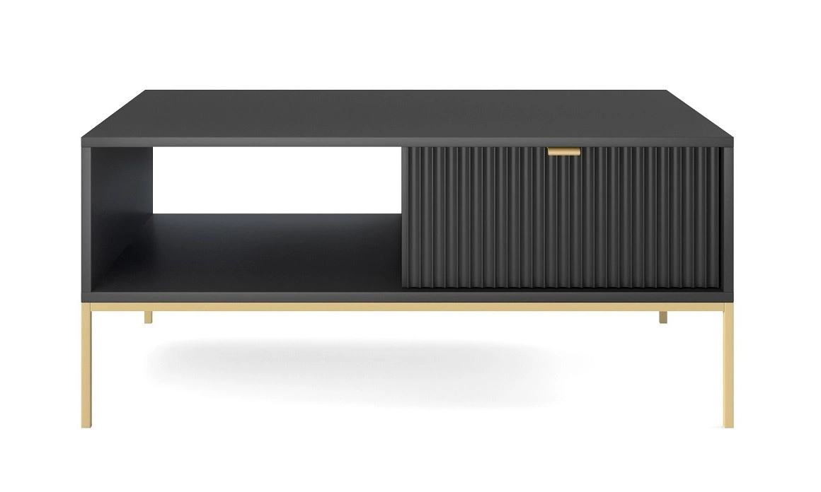 Stolik kawowy Lovro czarny z szufladami nowoczesny design blat odporny na rozlane ciecze złote metalowe nogi