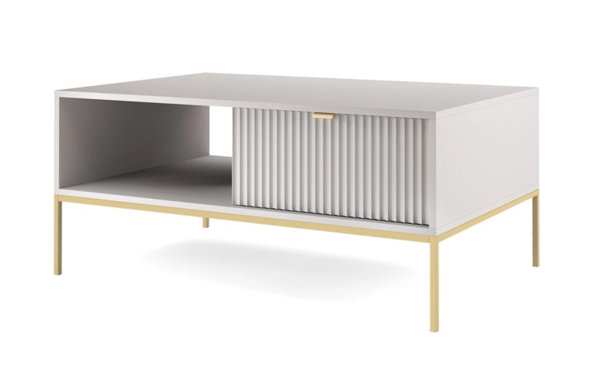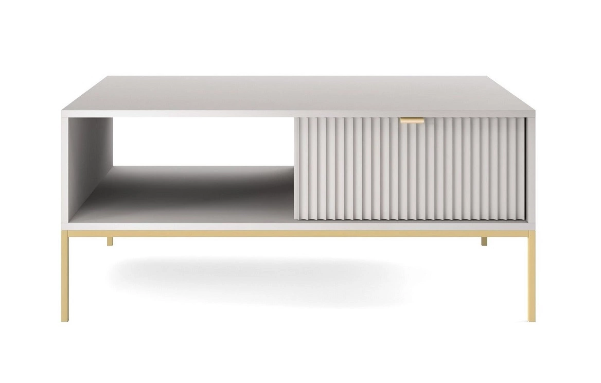 Ryflowane fronty szuflad wykonane z płyty MDF o grubości 18mm dodają szczególnego uroku. Stylowym wykończeniem frontów są uchwyty krawędziowe w kolorze złotym. Konstrukcję mebla urozmaicono złotymi metalowymi nogami o wysokości 20 cm.