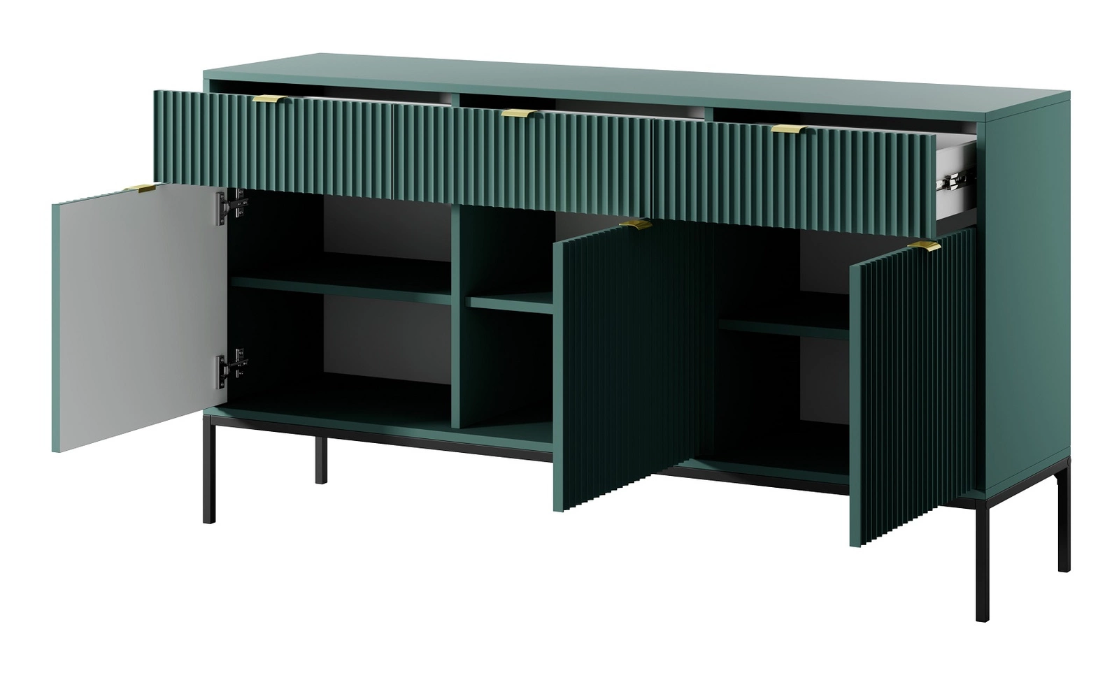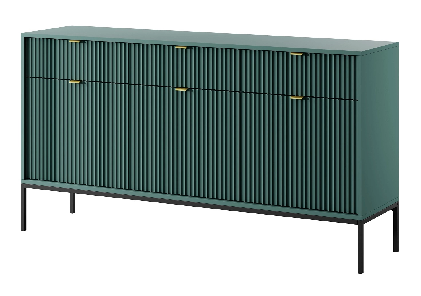 Ryflowane fronty wykonane z płyty MDF o grubości 18mm dodają szczególnego uroku. Stylowym wykończeniem frontów komody są uchwyty krawędziowe w kolorze złotym. Konstrukcję mebla urozmaicono czarnymi metalowymi nogami o wysokości 20 cm.