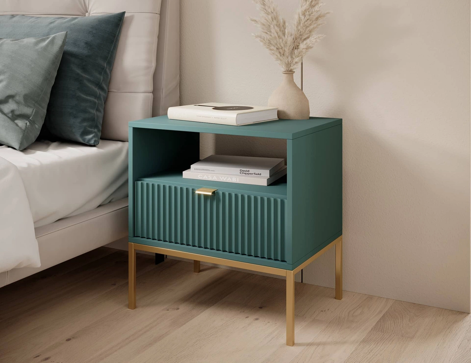 Szafka nocna z szufladą Lovro pastelowy zielony gustowny ryflowany dekor idealna szafka do sypialni złote metalowe dodatki