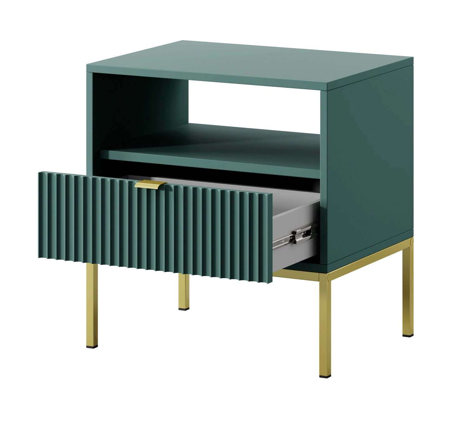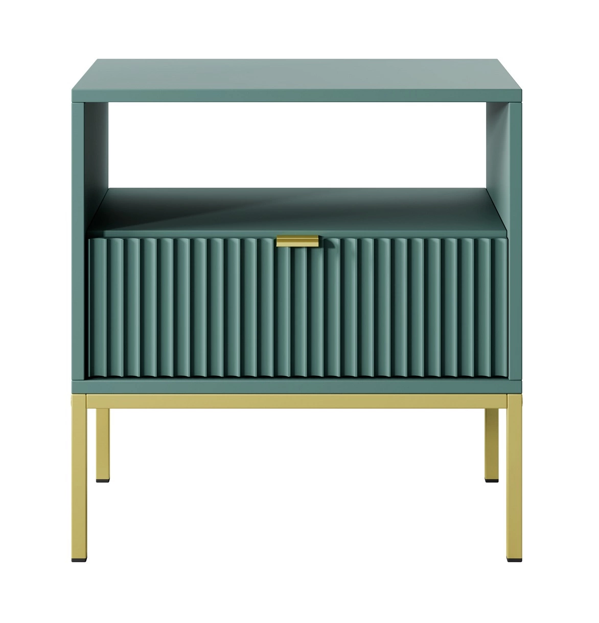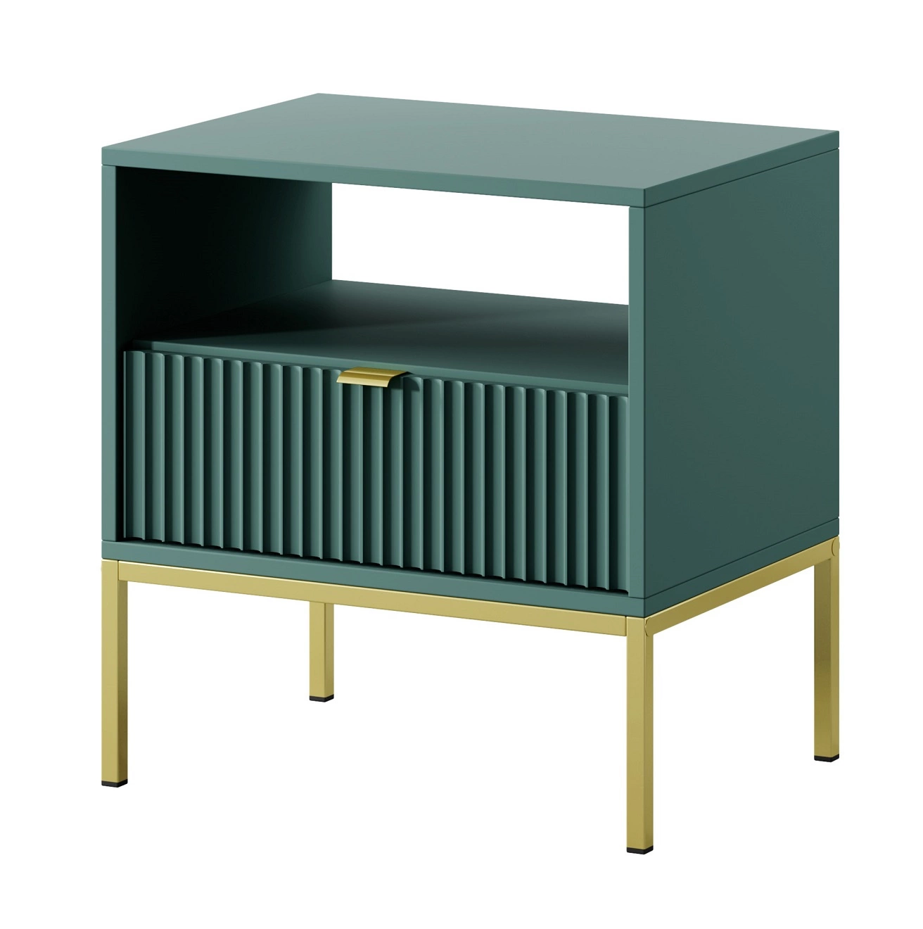 Ryflowany front szuflady wykonany z płyty MDF o grubości 18mm dodaje szczególnego uroku. Stylowym wykończeniem frontu szafki nocnej jest uchwyt krawędziowy w kolorze złotym. Konstrukcję mebla urozmaicono złotymi metalowymi nogami o wysokości 20 cm.