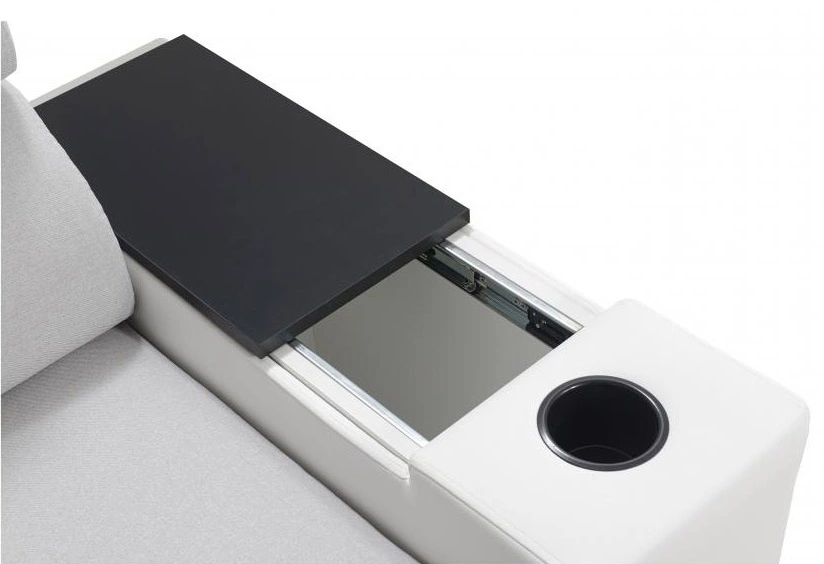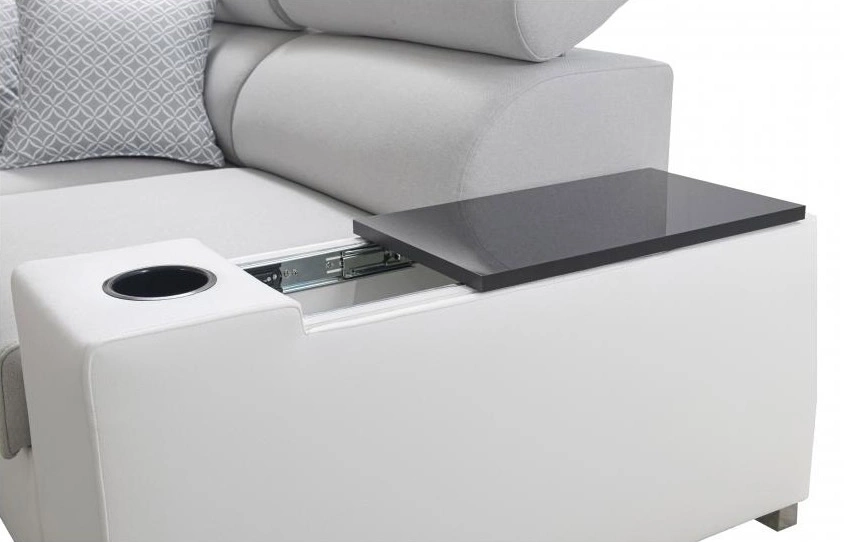 Dodatki tego mebla, które docenią wszyscy użytkownicy to pojemnik na pościel, funkcja spania, regulowane zagłówki, otwierany barek oraz uchwyty na kubki w boczkach.