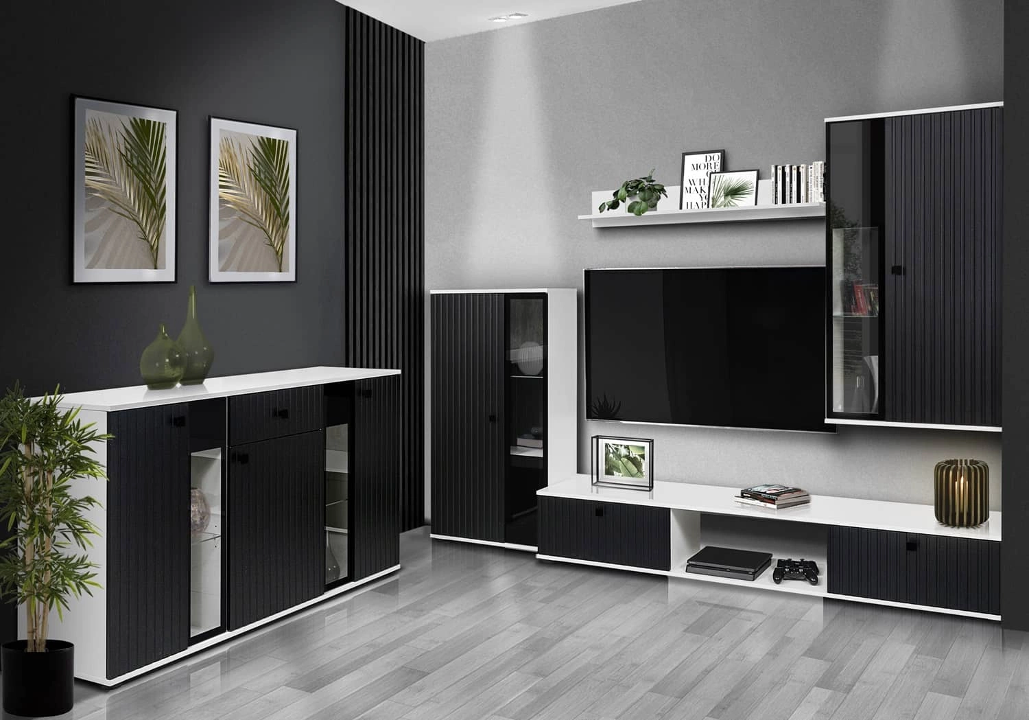 Mebel jest skonstruowany z 3 drzwi i 1 szuflady wysuwanej na prowadnicach kulkowychPrzeszklone drzwi pozwolą wyeksponować stylowe dodatki. Szyby zewnętrznych drzwi komody są wykończone ramką w kolorze czarnym. W komodzie Senja są zastosowane metalowe czarne uchwyty. Subtelne oraz nietuzinkowe frezowanie frontu we wzór lameli nadaje lekkości i stylu.