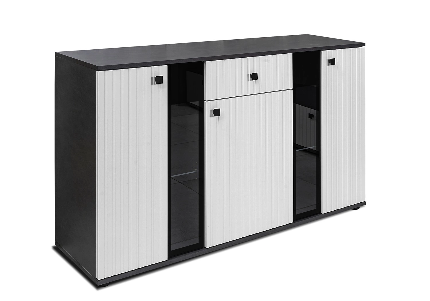 Mebel jest skonstruowany z 3 drzwi i 1 szuflady wysuwanej na prowadnicach kulkowych. Przeszklone drzwi pozwolą wyeksponować stylowe dodatki. Szyby zewnętrznych drzwi komody są wykończone ramką w kolorze czarnym. W komodzie Senja są zastosowane metalowe czarne uchwyty. Subtelne oraz nietuzinkowe frezowanie frontu we wzór lameli nadaje lekkości i stylu.