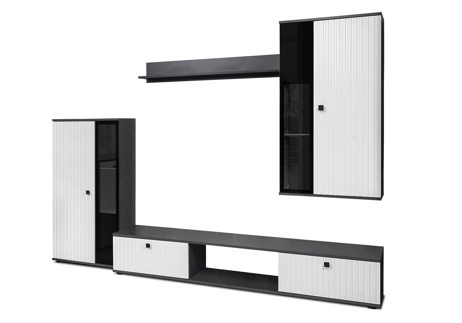 Meblościanka Senja matera / biała nowoczesny design ozdobne ryflowane fronty z metalowymi uchwytami