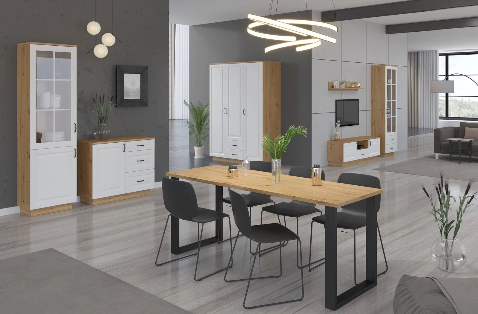 Szafa z kolekcji Scandi to idealna propozycja dla osób ceniących klasyczne aranżacje. Wyraziste połączenie dębowego korpusu z białymi frontami wykończonymi stylowym frezem sprawia, że całość prezentuje się bardzo elegancko. Dopełnieniem frontów szafy z szufladami są metalowe uchwyty w kolorze czarnym, które poza swoją podstawową funkcją, nadają meblom niepowtarzalnego stylu. Szafa z powodzeniem odnajdzie się we wnętrzach w stylu klasycznym, skandynawskim oraz nowoczesnym.