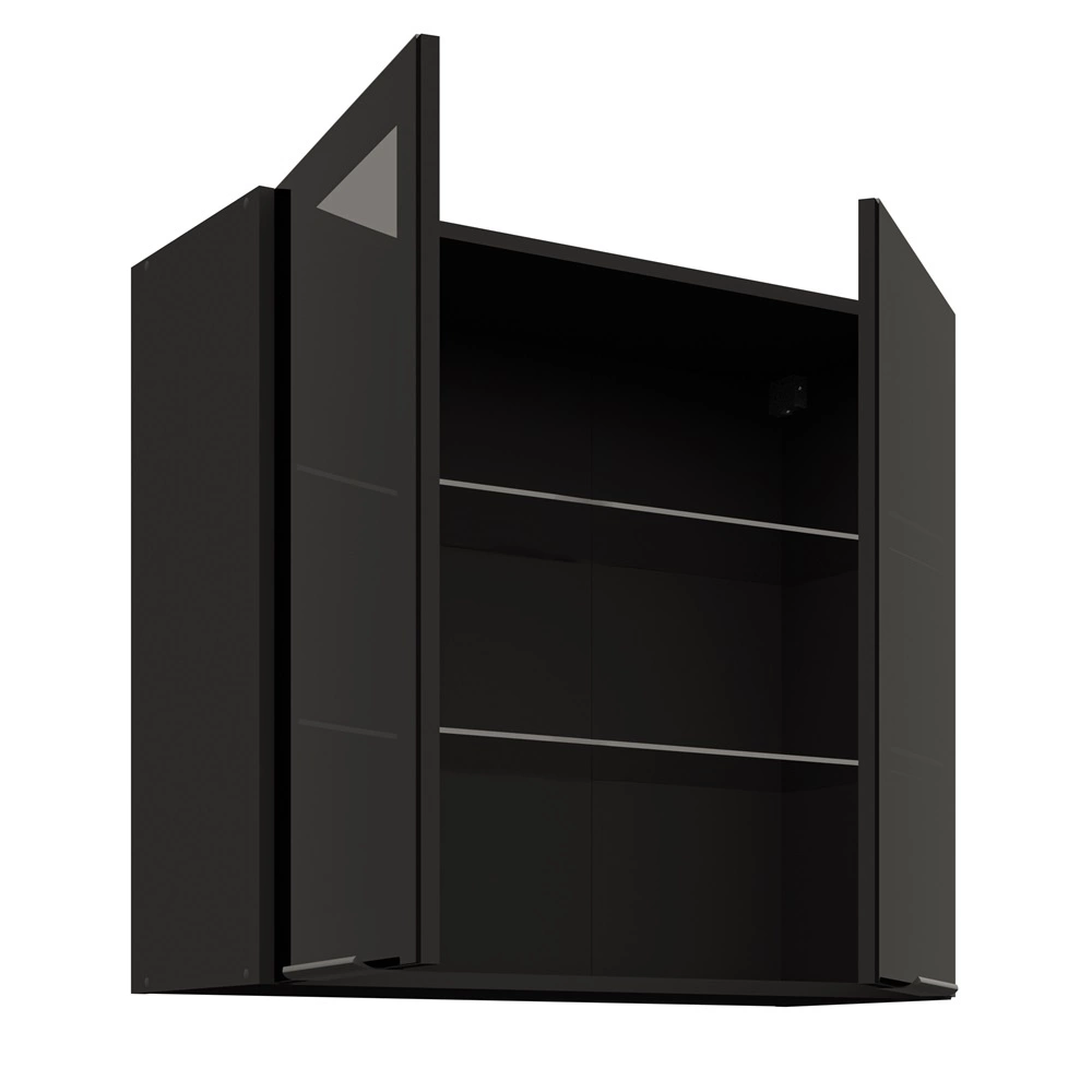 Korpus oraz fronty każdej szafki kuchennej są wykonane z wysokiej jakości płyty laminowanej o grubości 16 mm, obrzeża są zabezpieczone okleiną ABS. Fronty wykazują wysoką wytrzymałość na działanie wilgoci oraz przypadkowe uszkodzenia. Stylowym wykończeniem frontów szafek kuchennych są czarne, metalowe uchwyty krawędziowe. Przeszkloną szafkę kuchenną wyposażono w szklane półki o grubości 5mm. Przeszklony front szafki wykonany jest z bezpiecznego szkła hartowanego w ciemnym odcieniu. Szafki kuchenne górne wyposażono w system zawieszania na uniwersalnej listwie montażowej.