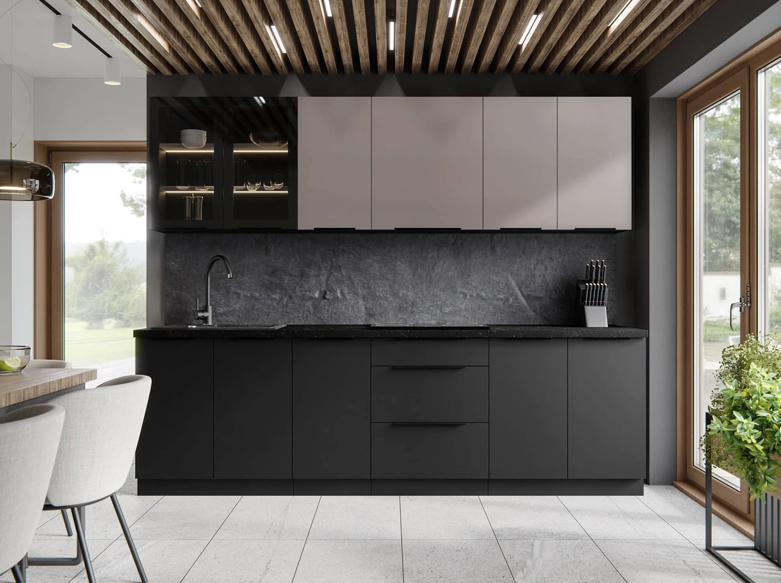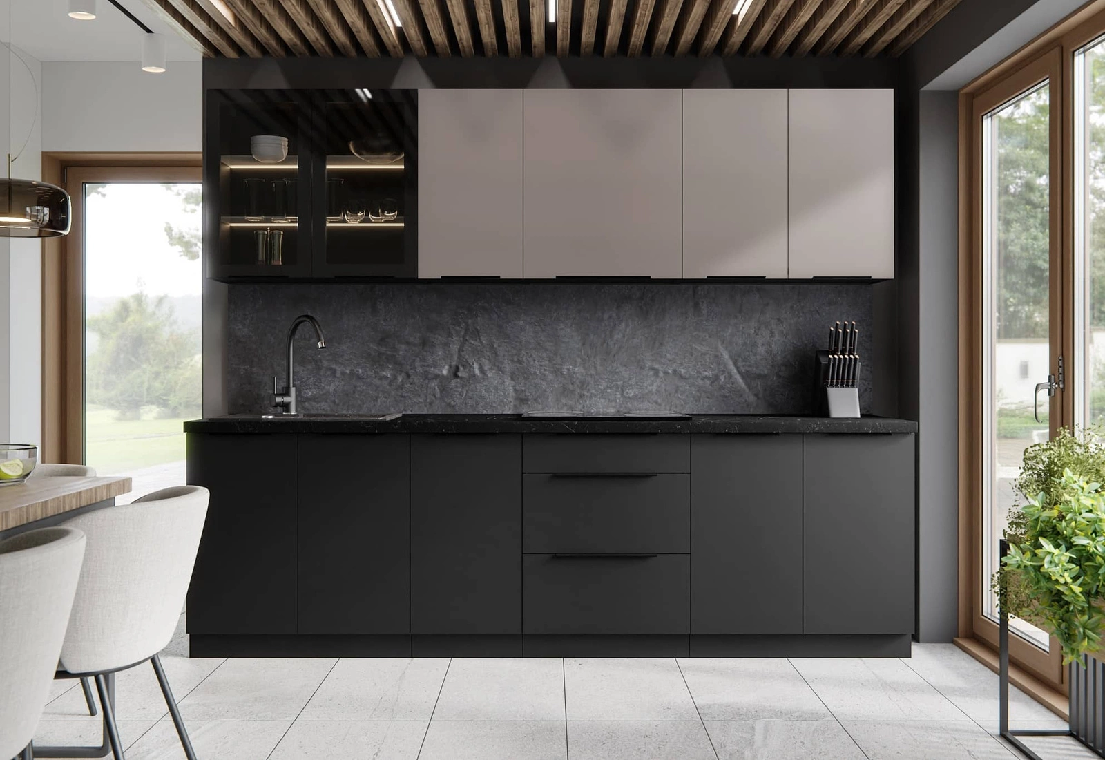 Zestaw mebli kuchennych Tarraco / Black 260 cm metalowe uchwyty krawędziowe szafki doskonale prezentują się w nowoczesnych wnętrzach