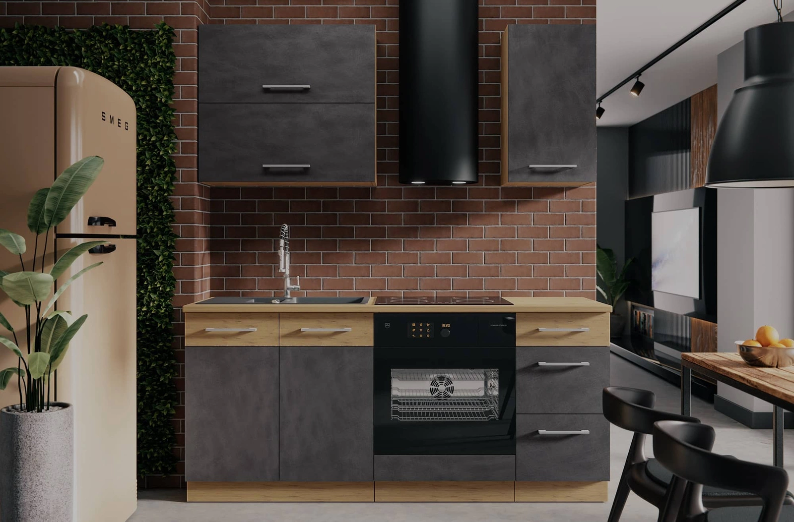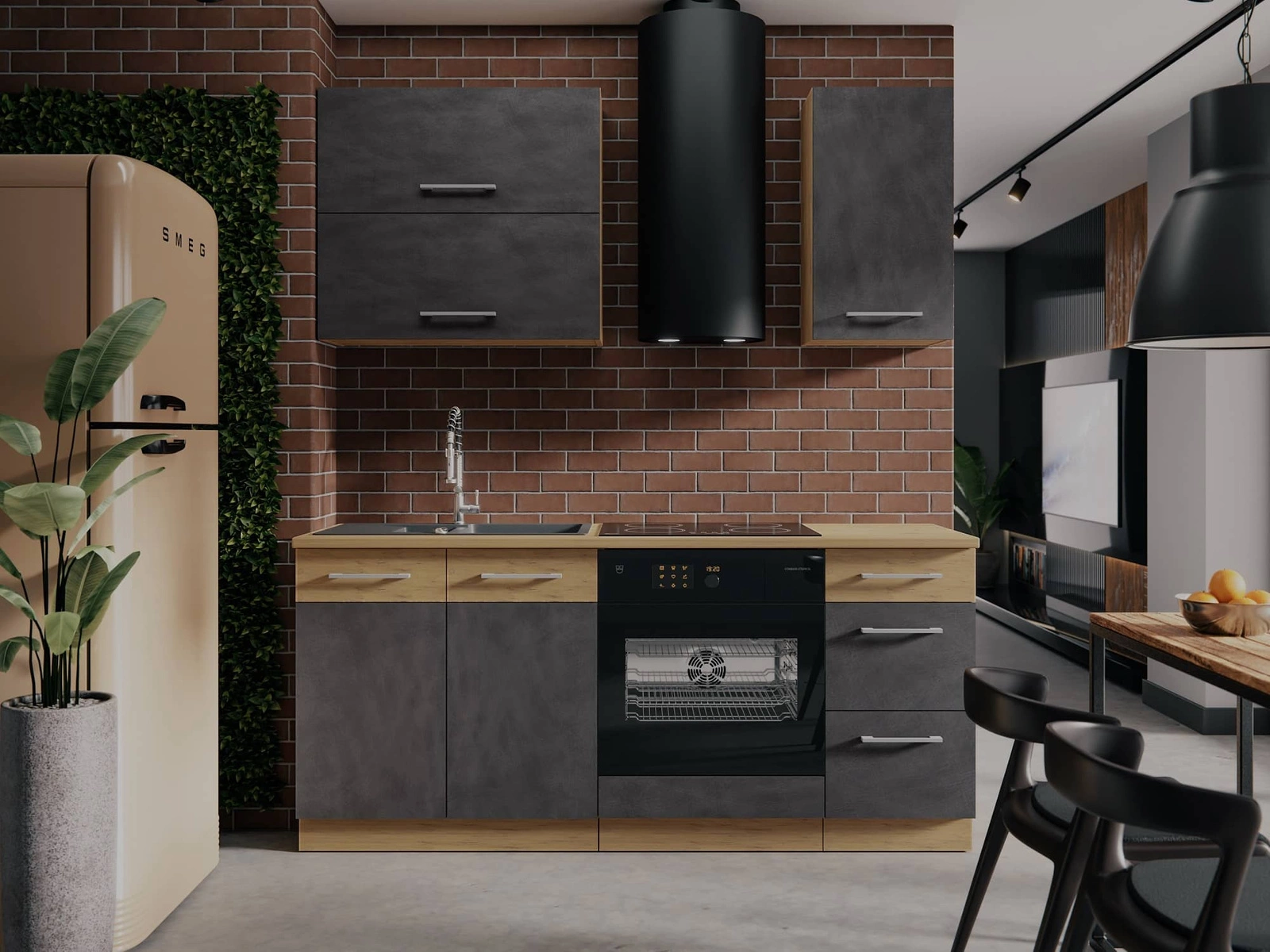 Dzięki uniwersalnemu ustawieniu, meble kuchenne dopasują się do wnętrza każdej kuchni. Fronty w kolorze matera oraz korpusy wykończone w dębowym dekorze, nadają meblom kuchennym szczególnego charakteru. Czarne uchwyty podkreślają elegancję szafek kuchennych.