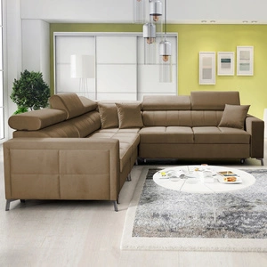 Narożnik z funkcją spania Nausa jasny brąz lewostronny velvet stylowy komfortowy narożnik regulowane zagłówki pojemnik na pościel