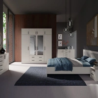 Zestaw mebli do sypialni Caspe beżowy geometryczne proste bryły o ponadczasowym designie czarne uchwyty komplet mebli z szafą