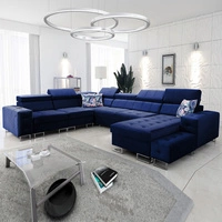 Narożnik z funkcją spania Hampton VII granatowy prawostronny narożnik do pokoju wykonany z aksamitnej tkaniny o gładkiej powierzchni