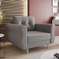 Fotel Wilkins jasny szary elegancki fotel do salonu z obszernym i miękkim siedziskiem drewniane nóżki nadają wizualnej lekkości