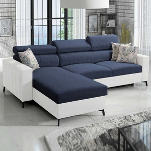 Narożnik z funkcją spania Savona granatowy / biały lewostronny elegancki narożnik regulowane zagłówki dekoracyjne przeszycia