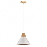 Lampa wisząca Link biała ciekawy design idealna lampa do sypialni z metalowym abażurem przełamana drewnianymi elementami