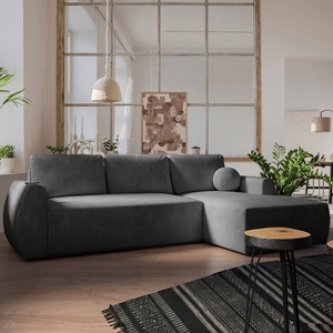 Narożnik z funkcją spania Colio grafitowy prawostronny stylowy narożnik o ciekawym kształcie welurowa tkanina ozdobna poduszka piłka