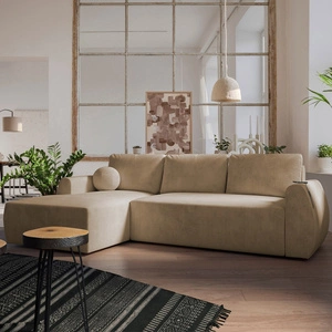 Narożnik z funkcją spania Colio ciemny beżowy lewostronny stylowy narożnik o ciekawym kształcie ozdobna poduszka piłka