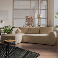 Narożnik z funkcją spania Colio beżowy lewostronny stylowy narożnik o ciekawym kształcie welurowa tkanina ozdobna poduszka piłka