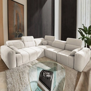 Narożnik z funkcją spania Cetara III kremowy prawostronny ergonomiczny narożnik z przesuwanym oparciem i regulowanymi zagłówkami