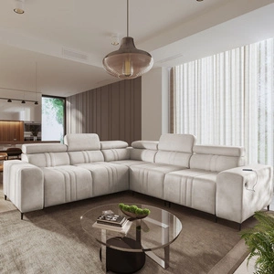 Narożnik z funkcją spania Castel XII beżowy lewostronny stylowy i wygodny narożnik do salonu funkcjonalne regulowane zagłówki