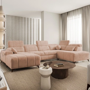 Narożnik z funkcją spania Penejos VII łososiowy lewostronny stylowy narożnik z pojemnikiem na pościel wygodne regulowane zagłówki