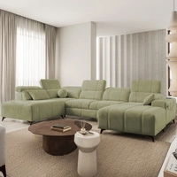 Narożnik z funkcją spania Penejos IX zielony prawostronny stylowy narożnik z pojemnikami na pościel wygodne regulowane zagłówki