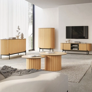 Stolik kawowy okrągły Rotto 80 cm dąb vincenza nowoczesny design solidna podstawa przyozdobiona dekoracyjnymi lamelami
