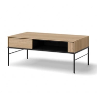 Stolik kawowy Visso dąb linearny stylowy design stolik z półką osadzony na stabilnej metalowej podstawie praktyczna konstrukcja