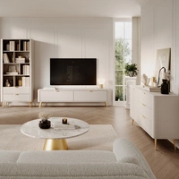 Zestaw mebli Lante beżowy designerskie ryflowania na frontach meblościanki metalowe uchwyty krawędziowe i wysokie skośne nogi