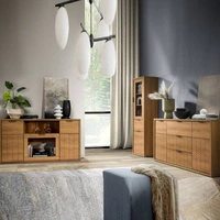 Zestaw mebli do salonu Fonti dąb karmel fronty ozdobione dekorem jodełki elementy z bezpiecznego szkła stylowe czarne uchwyty