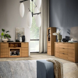Komoda Fonti 158 cm dąb karmel elegancka stylistyka komody drzwi ozdobione dekorem jodełki czarne uchwyty krawędziowe przeszkolony front