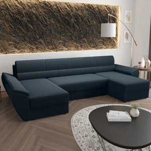Narożnik z funkcją spania Fogu U III niebieski stylowy narożnik z podłokietnikami i pojemnikiem na pościel sztruksowa tkanina